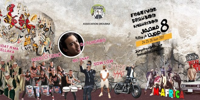 سيكون عشاق الموسيقى على موعد مع ألمع نجوم الغناء الشبابي، التي ستسطع في سماء منصة مهرجان دروبنا بخريبكة، أيام 24،25 و 26 غشت 2017، وتتميز الدورة الثامنة لمهرجان التي تنظمها جمعية دروبنا بالإضافة لمشاركة فنانين مرموقين على الصعيديين الوطني والدولي، بمجموعة من الأنشطة الموازية أبرزها أربع ورشات تكوينية في مجالات البرايك دانس، التركيب الموسيقي، المونتاج فيديو، و لأول مرة في لإقليم ورشة في الباتوكادا ( BATUCADA)، و سيشرف على هذه الورشات محترفين في المهن الموسيقية و الفن عامة.